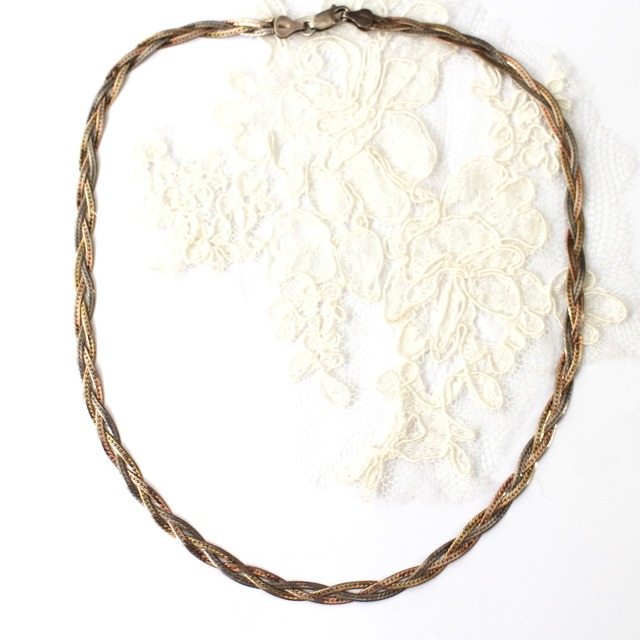 シルバーにカラー違いのゴールドがプレートされた 3つのチェーンを緩やかに編み込んだ ブレイドデザインのネックレス。 動くたびにしっとりとした陰影が生まれ 控えめながら印象に残ります。 シンプルな服装に奥行きを加えたいときに。 ++++++++ 1950-70年代頃 イタリア製 ++++++++ 素材:シルバー 首回り : 約44.5㎝ ++++++++ *年代は推定です。 *お使いの端末画面によって色の見え方が異なる場合があります。 *全ての古いのもにおきまして、経年による多少の傷、汚れに関してはご了承下さいますようお願い致します。古いものの特性としてお楽しみ頂けると幸いです。 傷、汚れの激しいものに関しては説明文に記載致します。 気になる点がございましたら必ずご購入前にお問合せください。