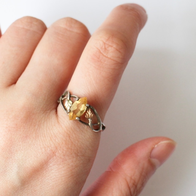 温かみのあるハニーイエローのシトリンを中心に 透かしのあるシルバーフレームで包み込んだデザイン。 マーキスカットの石が光を受けるたびにシャープな輝きを放ち クラシカルな雰囲気の中に軽やかさを感じさせます。 アームのリーフモチーフには 2色のゴールドでコーティングされ 優しいカラーが指に馴染みます。 繊細さと個性を両立したアールヌーボー期のシルバーリングです。 ヴィンテージの風合いを残したままにしておりますが、ピカピカのシルバーがよければ磨いてお送りします。 ご注文の際に備考欄にご記入くださいませ。 写真のアンティークボックスは撮影用小物のため付属いたしません。 ++++++++ 1910年代頃 イギリス買付け ++++++++ 素材:シルバー、シトリン サイズ:約17.5号 シトリン縦 : 約1.1㎝ 横 : 約0.5㎝ ++++++++ *サイズ変更はご相談くださいませ。 *お使いの端末画面によって色の見え方が異なる場合があります。また実際より大きく見える場合がございますので、サイズ表記をご参照ください。 *全ての古いのもにおきまして、経年による多少の傷、汚れに関してはご了承下さいますようお願い致します。古いものの特性としてお楽しみ頂けると幸いです。 傷、汚れの激しいものに関しては説明文に記載致します。 気になる点がございましたら必ずご購入前にお問合せください。