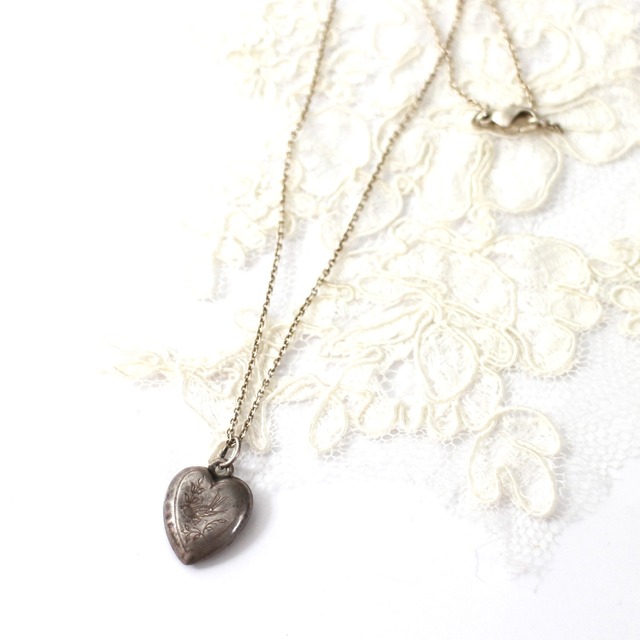 ほどよい厚みのあるシルバーのハートチャームが主役のヴィンテージシルバーネックレス。 ハートチャームには 小さいながら繊細な鳥デザインが彫られ 手の込んだ素敵なネックレスです。 長めチェーンで縦ラインを強調し 甘さを抑えた大人の佇まいに。 シンプルコーデでもスタイルアップしてくれるネックレスです。 ++++++++ 1950-70年代頃 イギリス買付け ++++++++ 素材:シルバー 首回り : 約50.5㎝ ++++++++ *年代は推定です。 *お使いの端末画面によって色の見え方が異なる場合があります。 *全ての古いのもにおきまして、経年による多少の傷、汚れに関してはご了承下さいますようお願い致します。古いものの特性としてお楽しみ頂けると幸いです。 傷、汚れの激しいものに関しては説明文に記載致します。 気になる点がございましたら必ずご購入前にお問合せください。