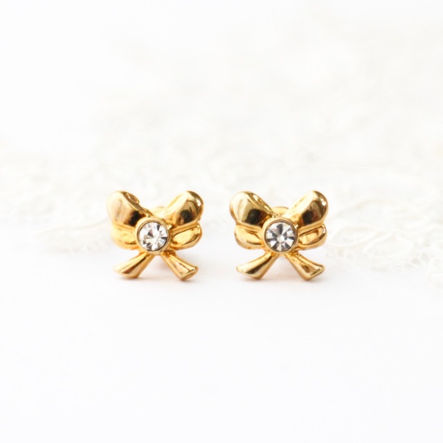 18世紀末のファッションアイコン、 マリー・アントワネット。 前回ロンドンでの買付けの際 V&A Museumで彼女のスタイルをテーマにした エキシビジョンを見に行きました。 そこで『やっぱりリボンモチーフって可愛い…』 とときめきが止まらず 気づけばリボンモチーフをたくさん選んでいました。 こちらはぷっくりとしたフォルムが可愛い ゴールドのリボンピアス。 中心にあしらわれたクリアストーンが 動くたびに小さく光を返してくれます。 クラシックなのに軽やかで デイリーにもおめかしにも馴染む万能なピアスです。