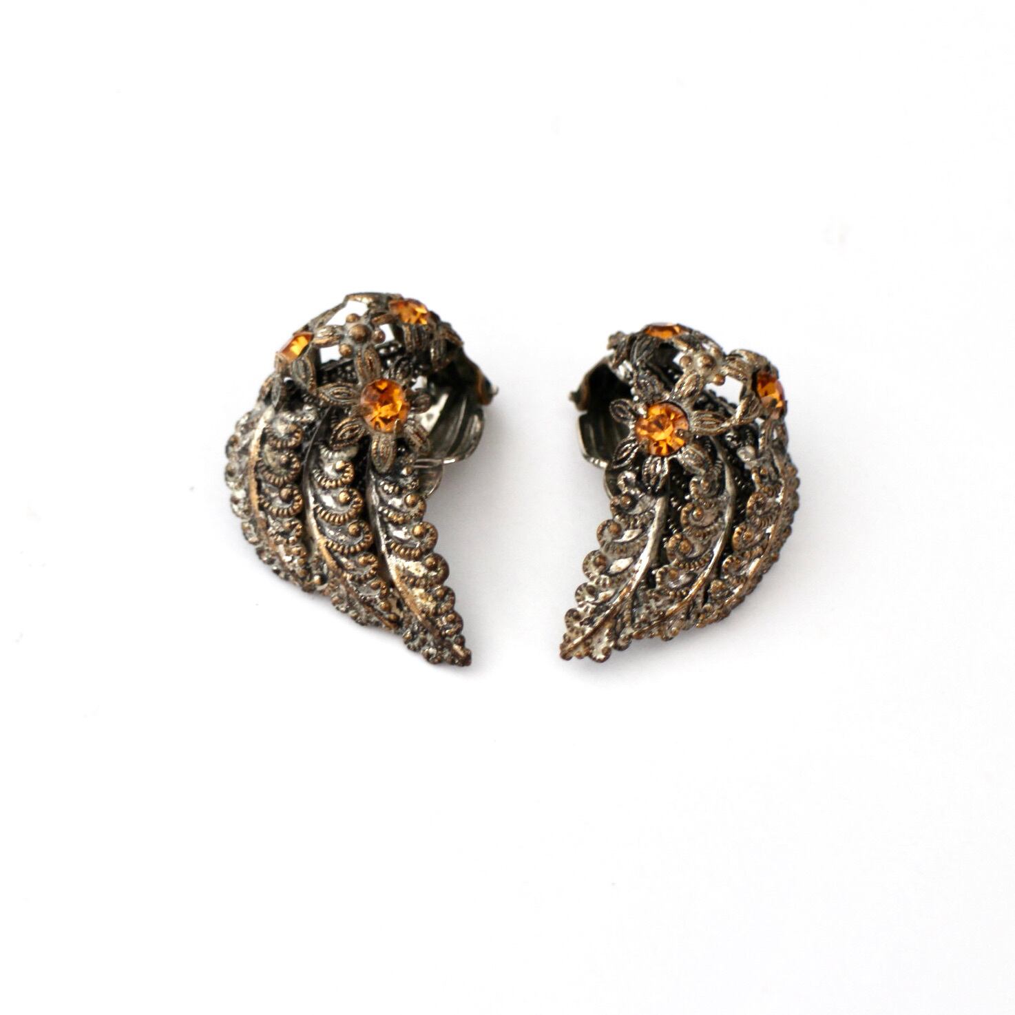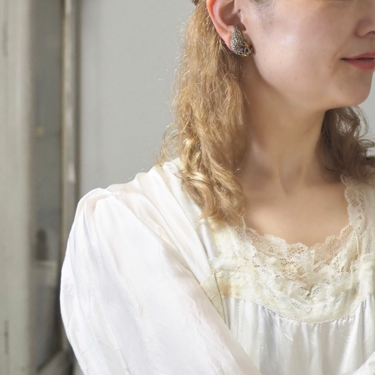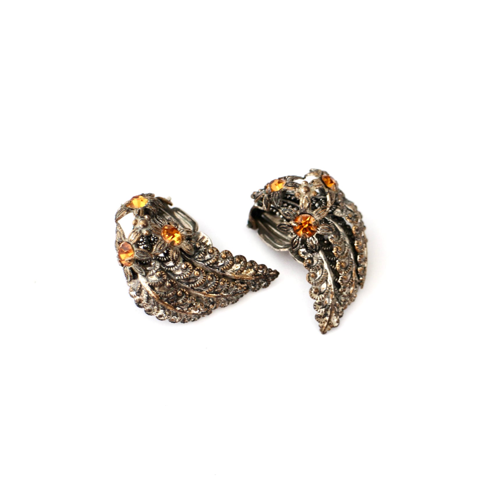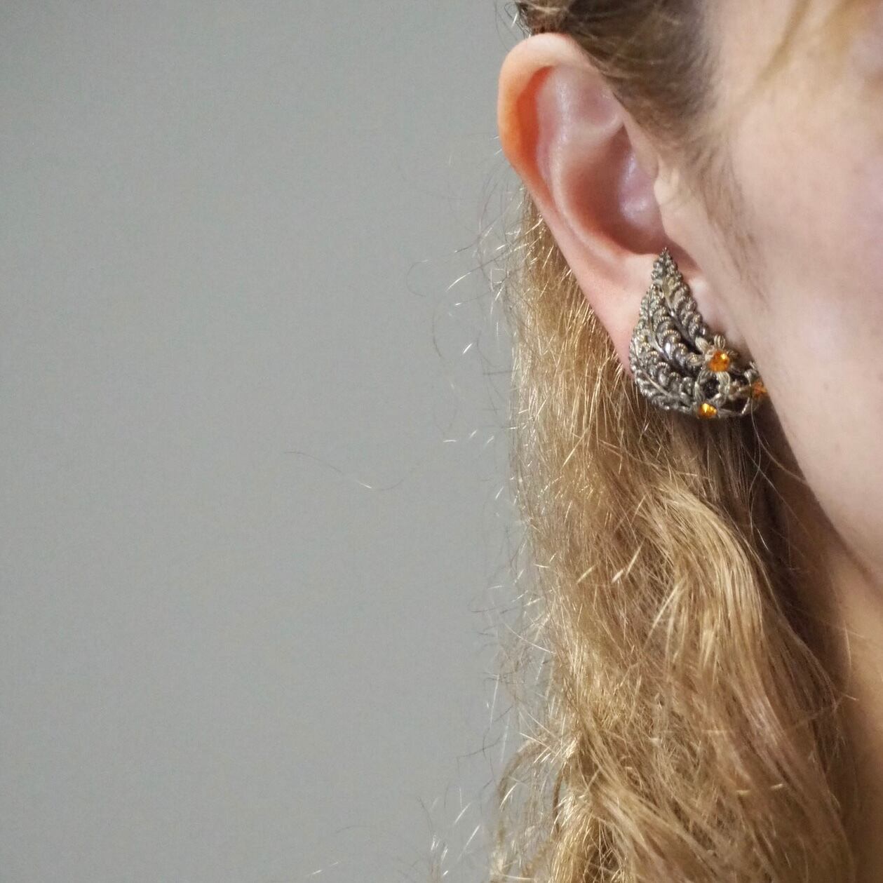 アンティークメタルフェザー*アンバーフラワー*ヴィンテージイヤリング