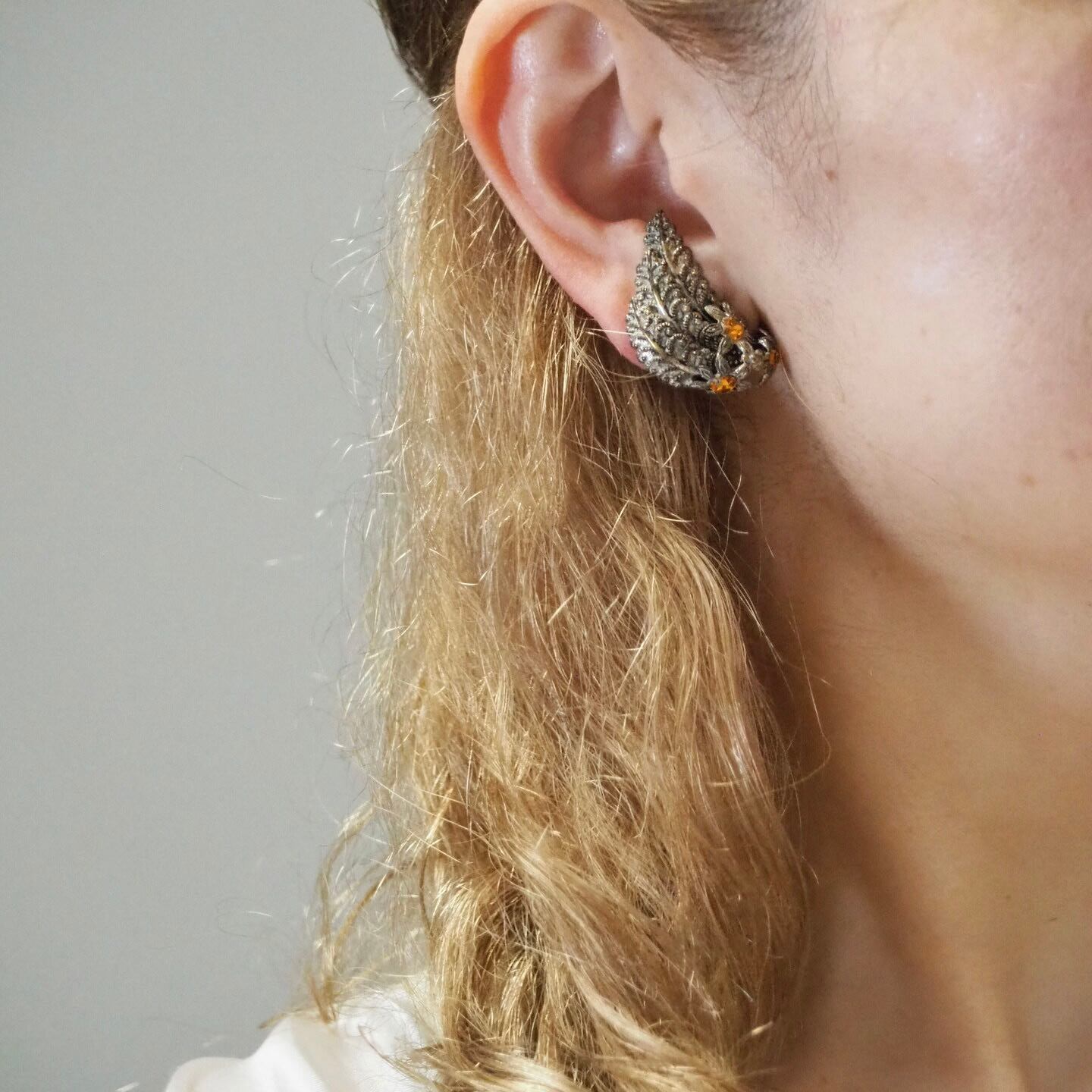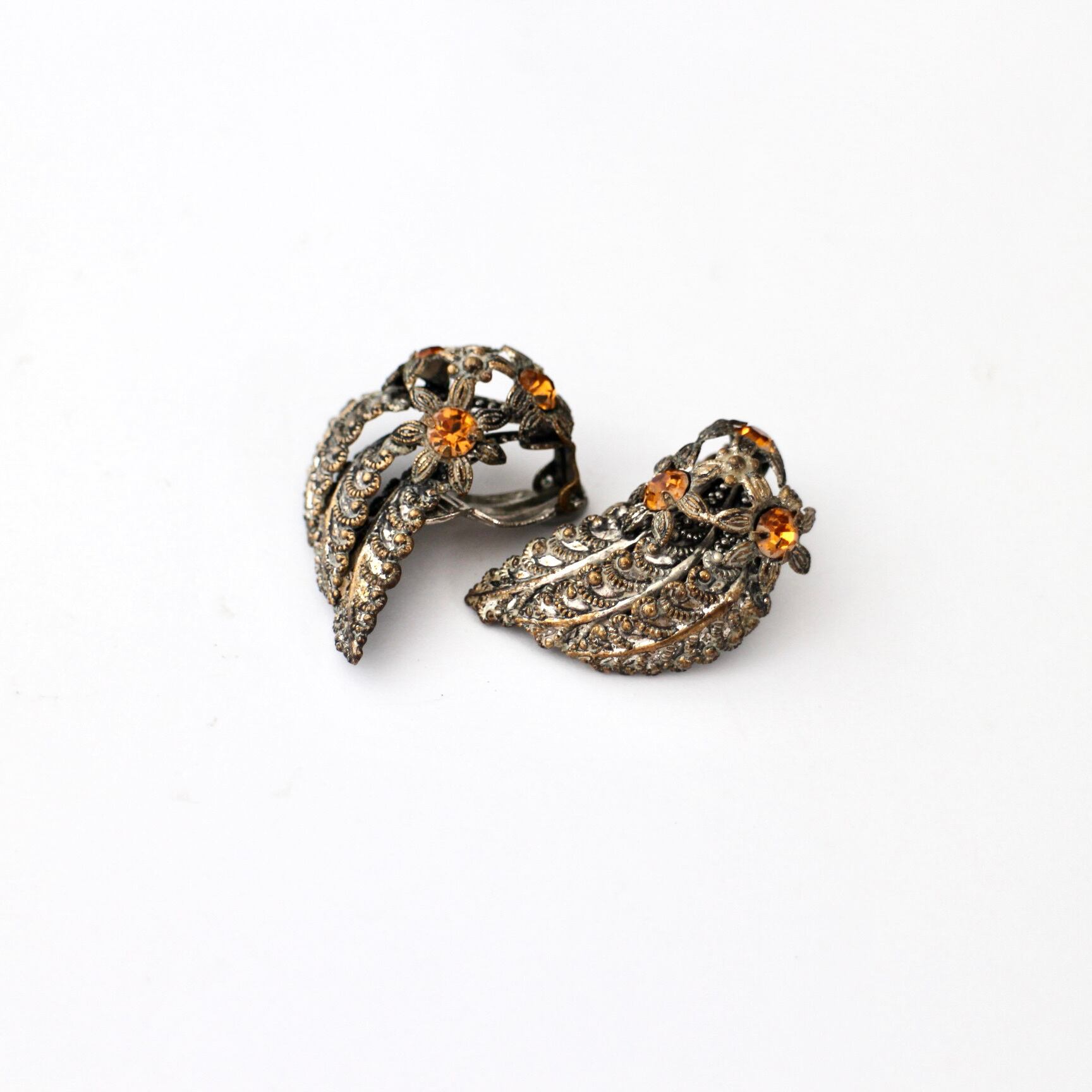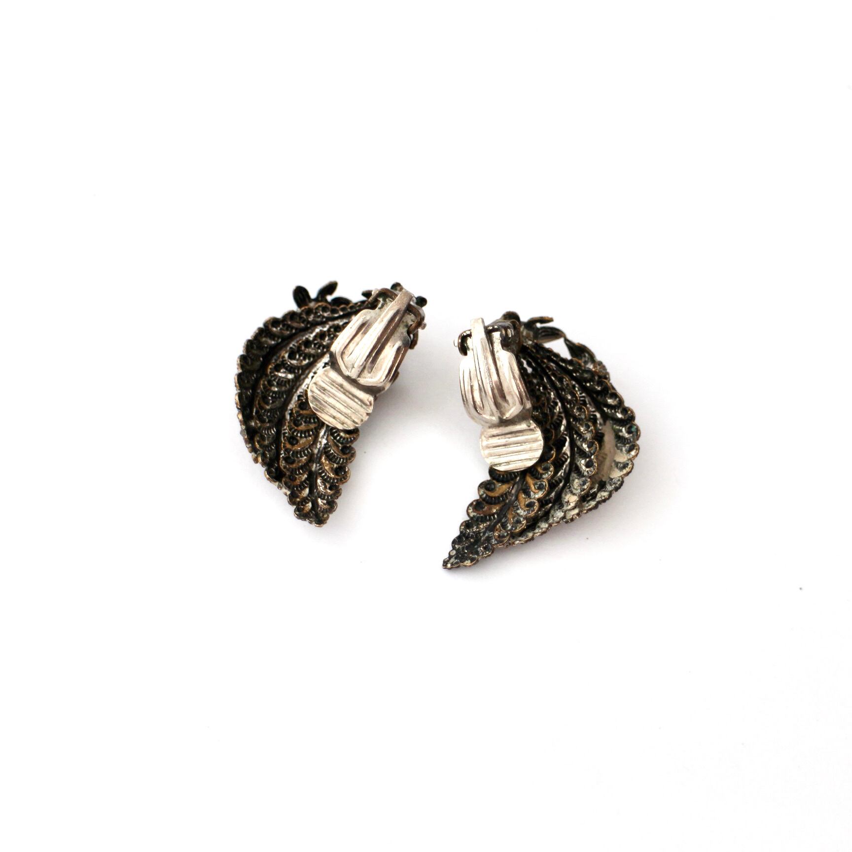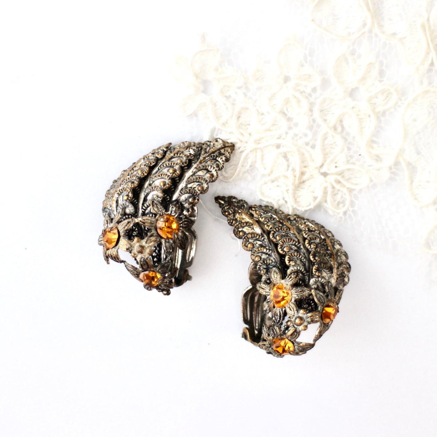 アンティークメタルフェザー*アンバーフラワー*ヴィンテージイヤリング
