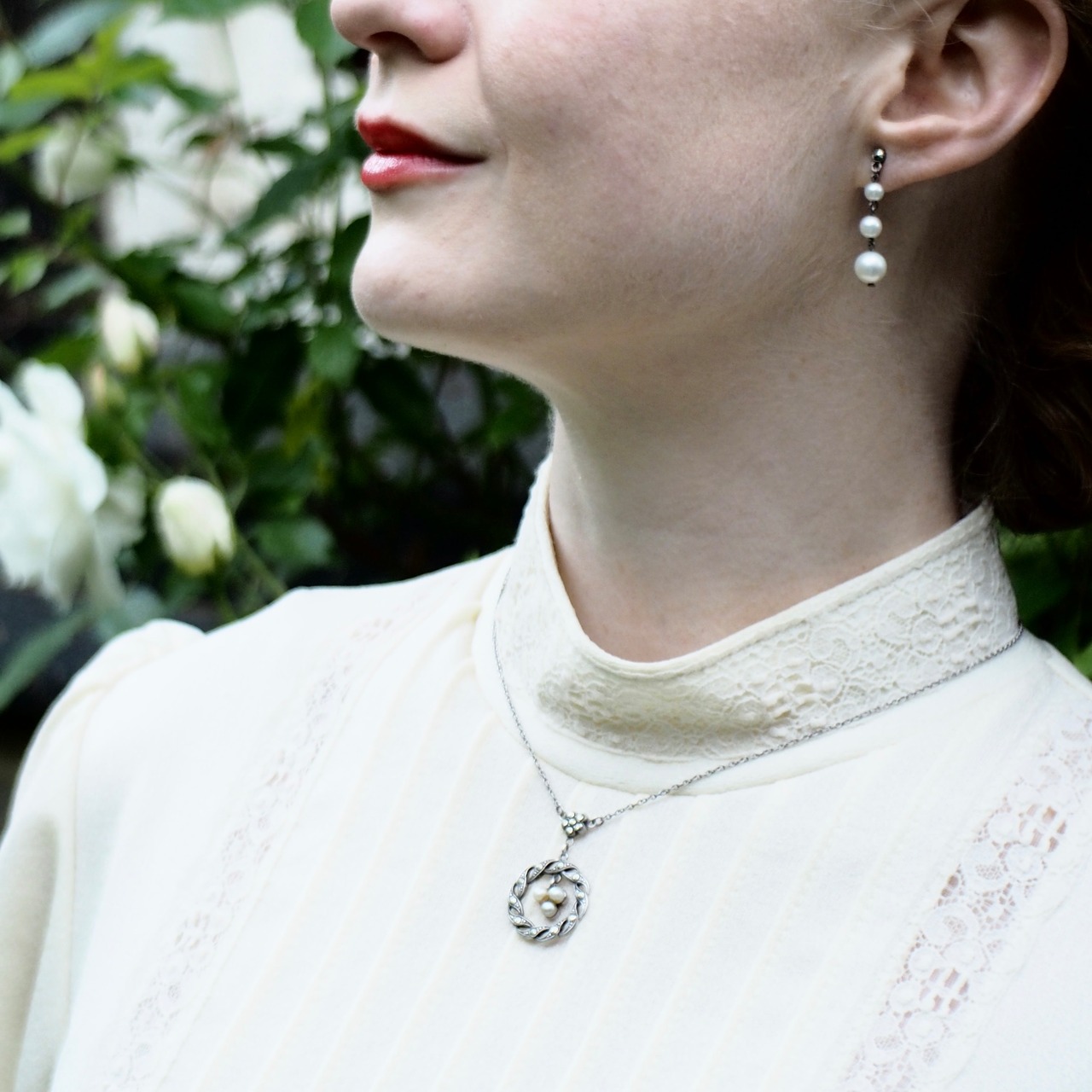 大小3粒のパールが並ぶシンプルなヴィンテージイヤリング。