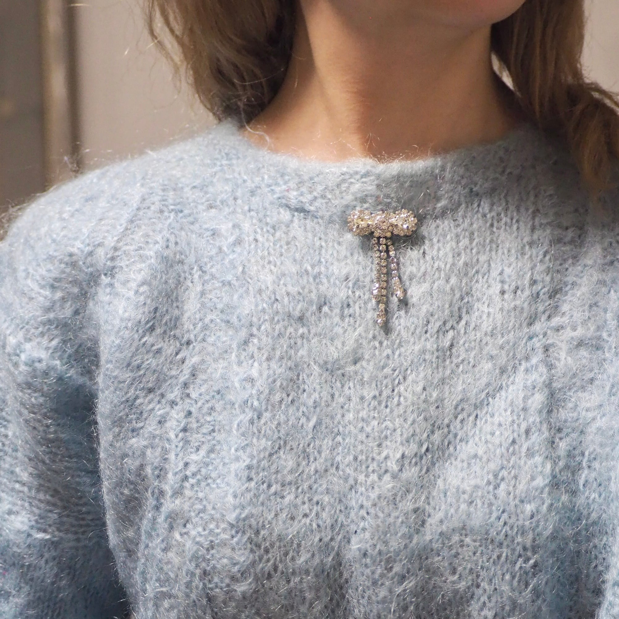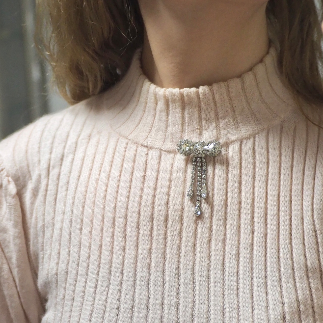ラインストーンのタッセルが印象的なリボンブローチ。