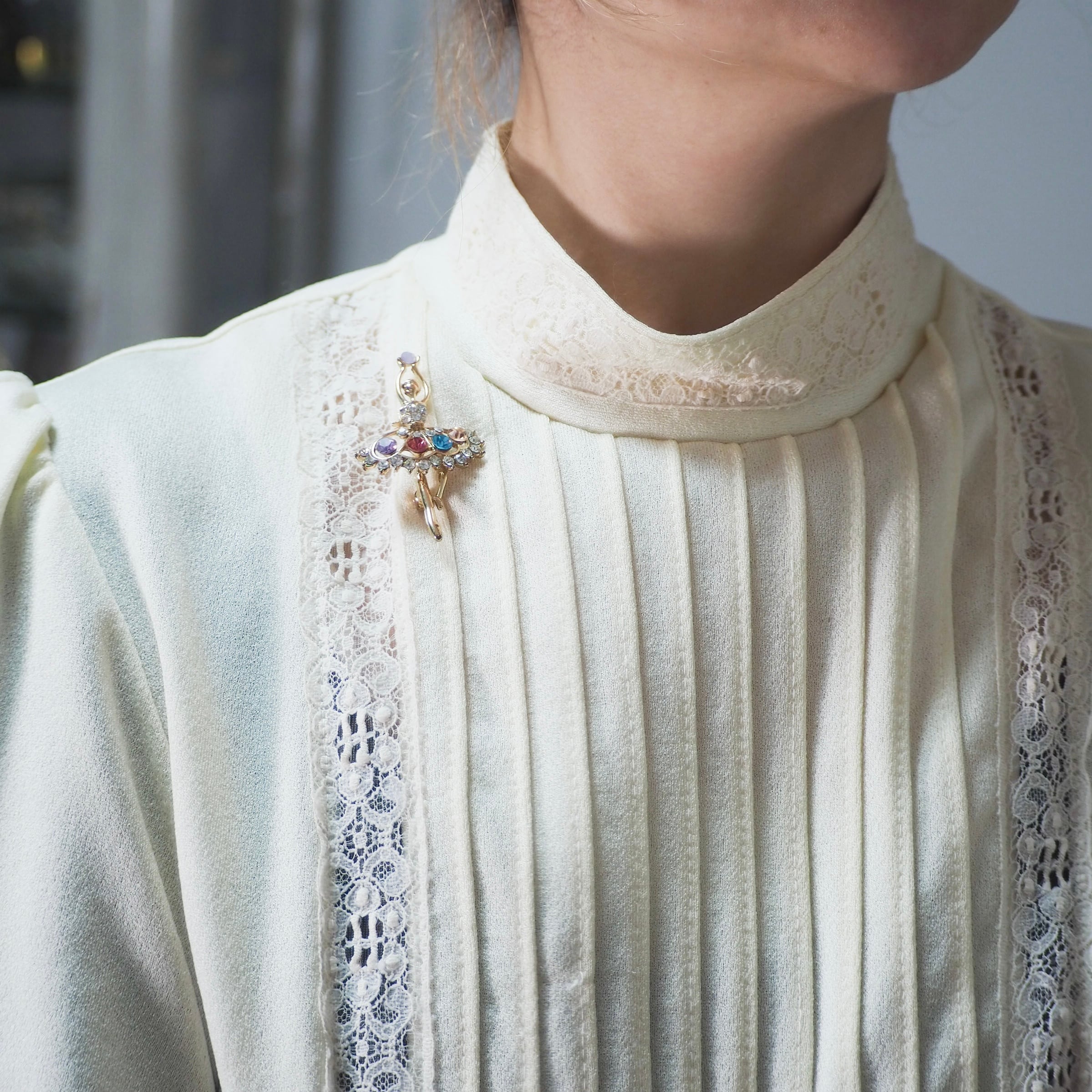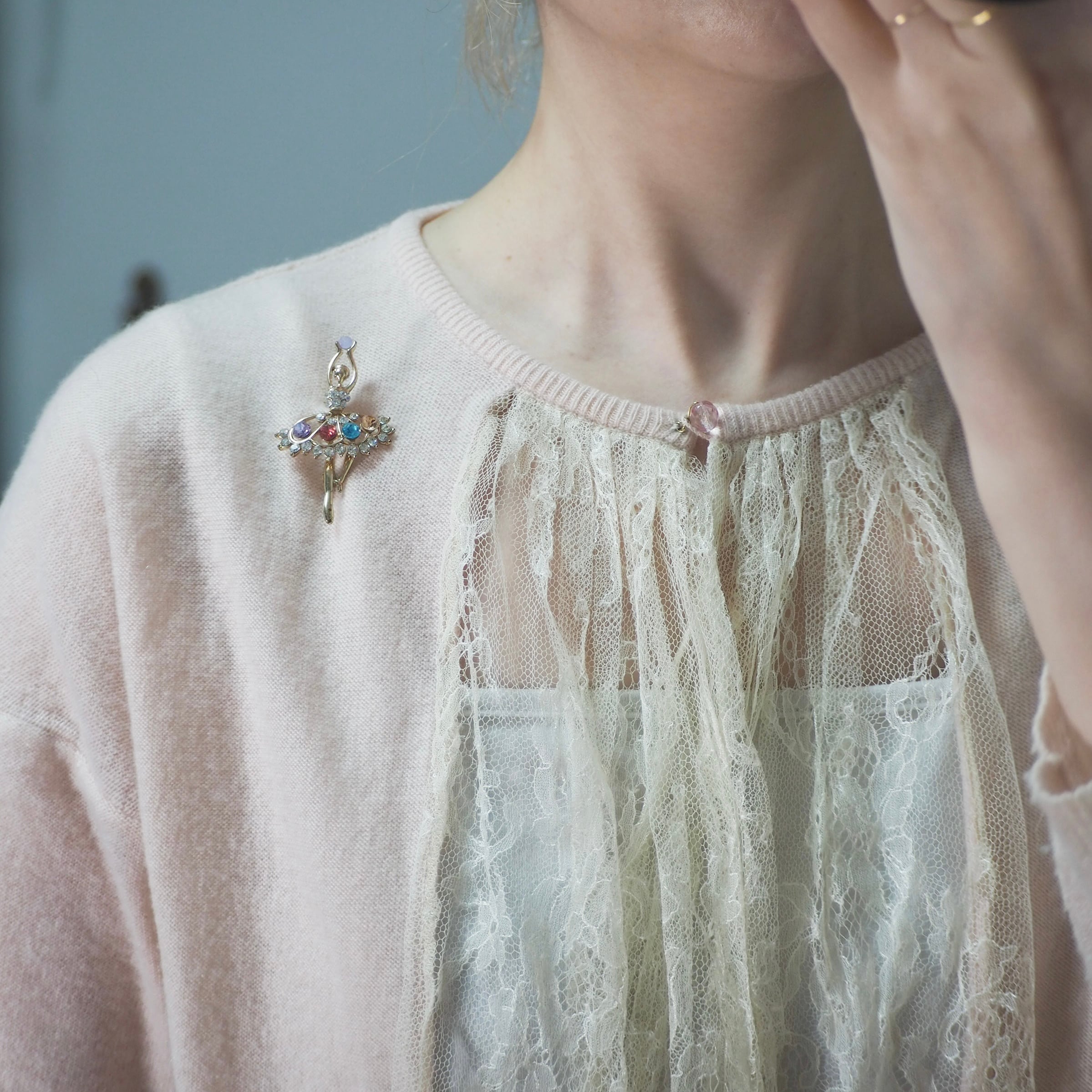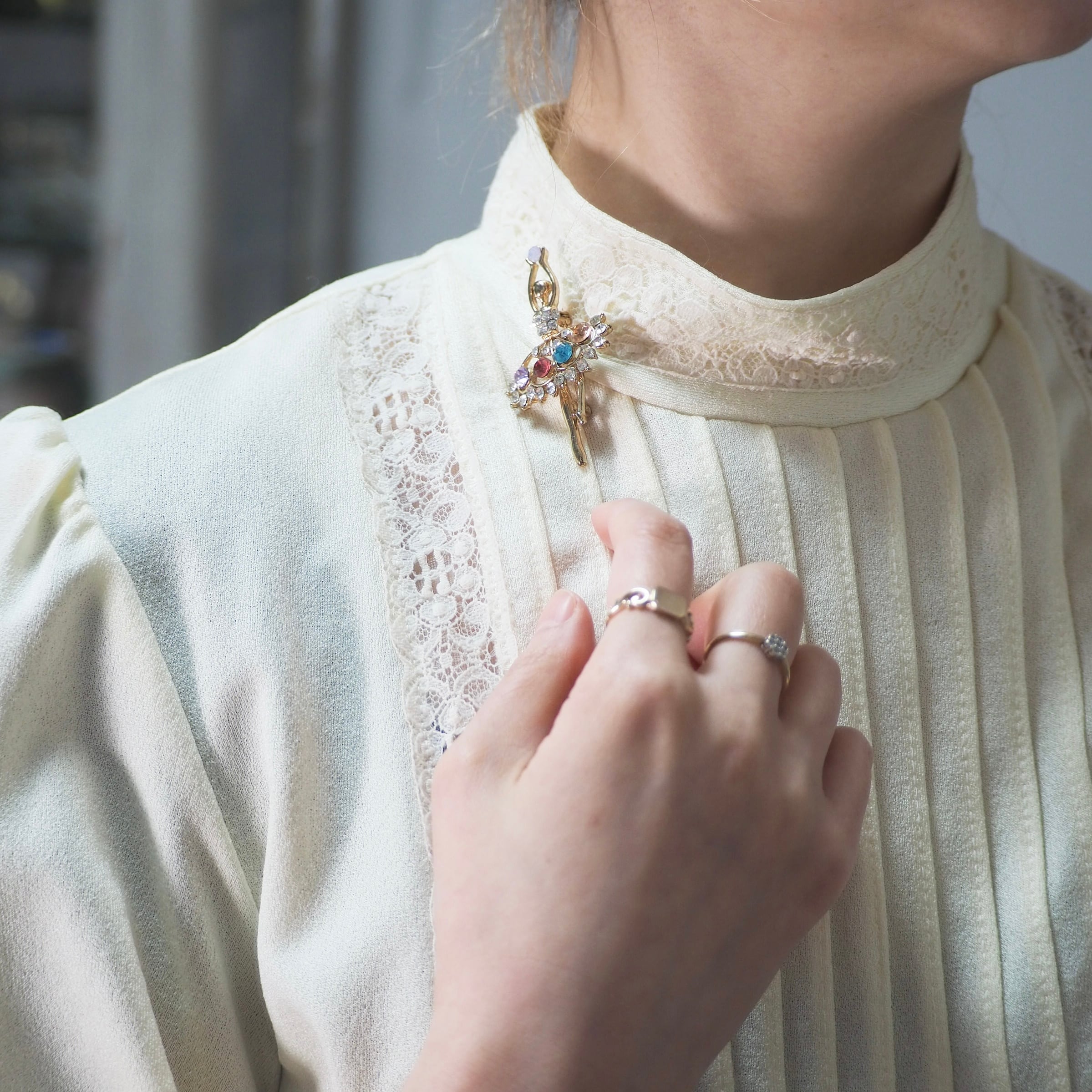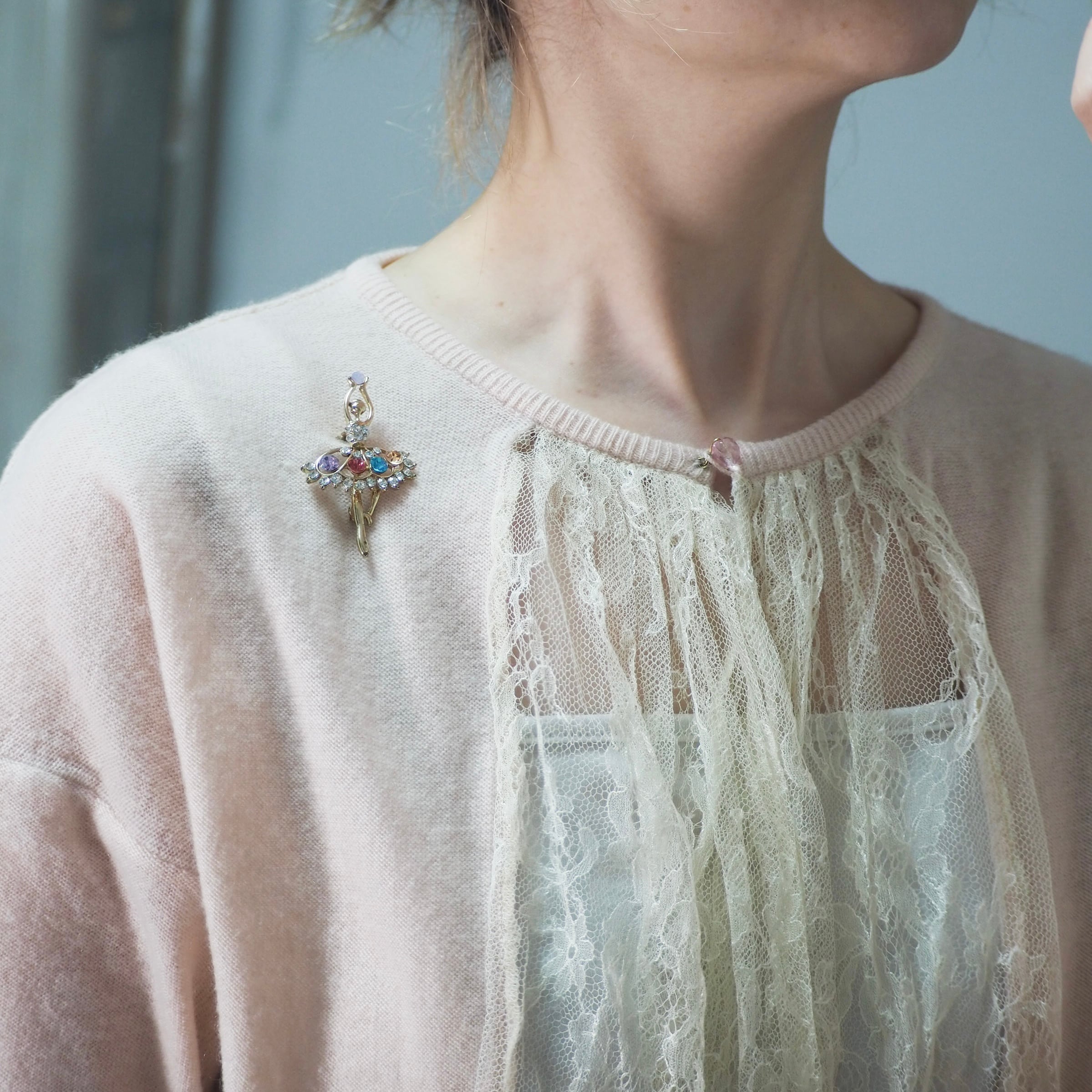 今まさに舞台の中央で回転している瞬間を切り取ったようなブローチ。