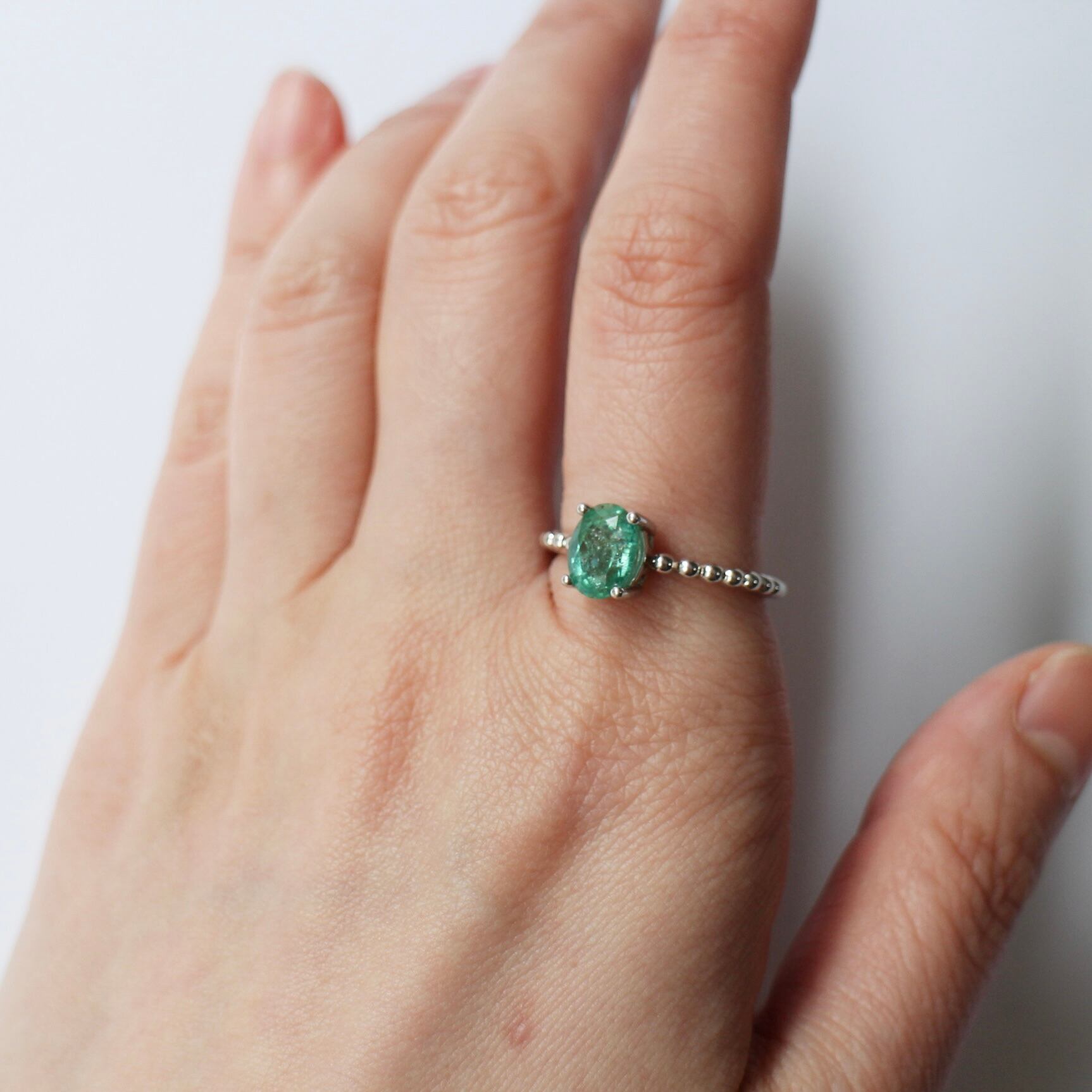 みずみずしいトーンのオーバルカットエメラルドを、