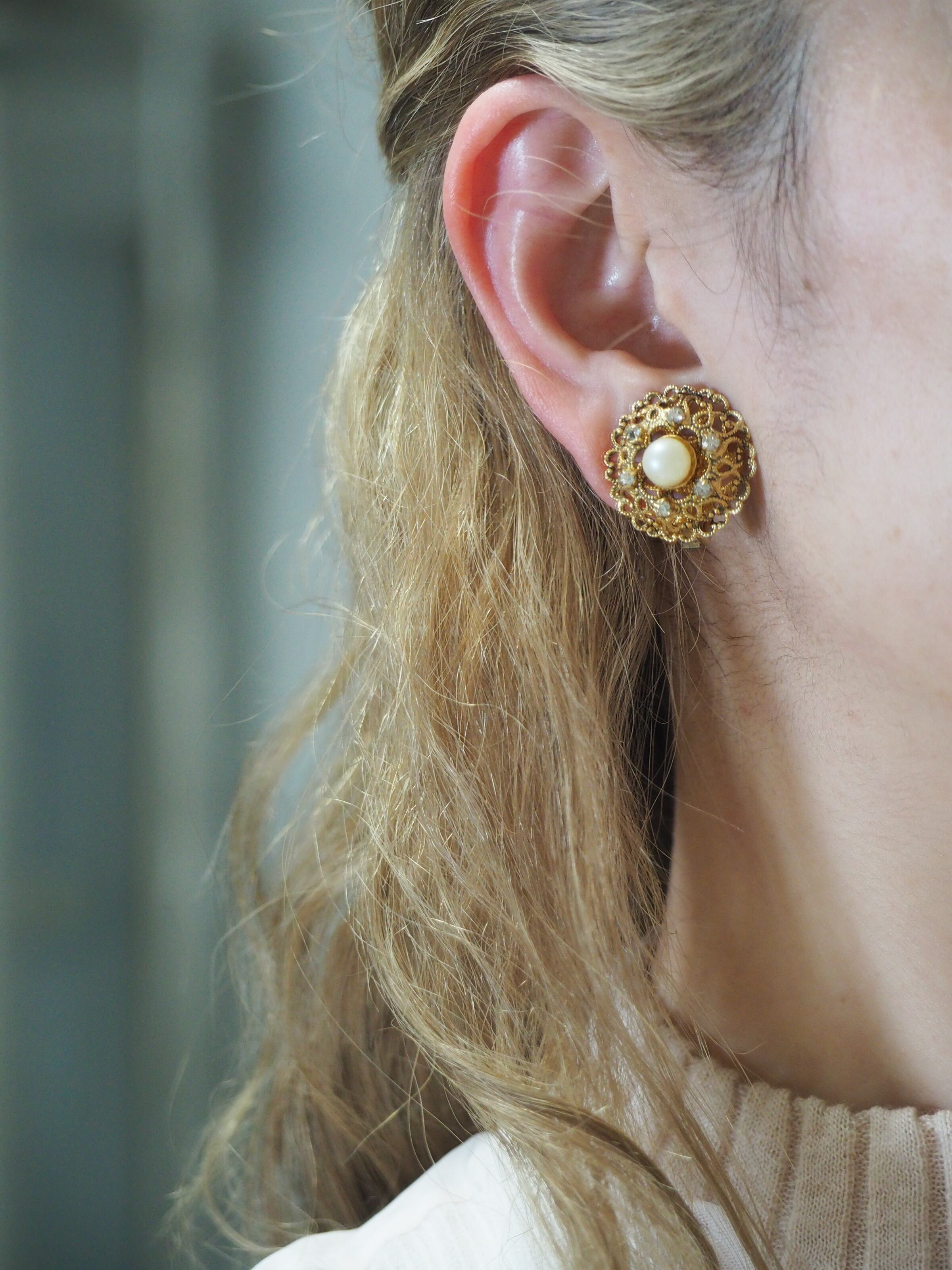 パール × クリアビジュー 繊細 メタルワーク ヴィンテージイヤリング