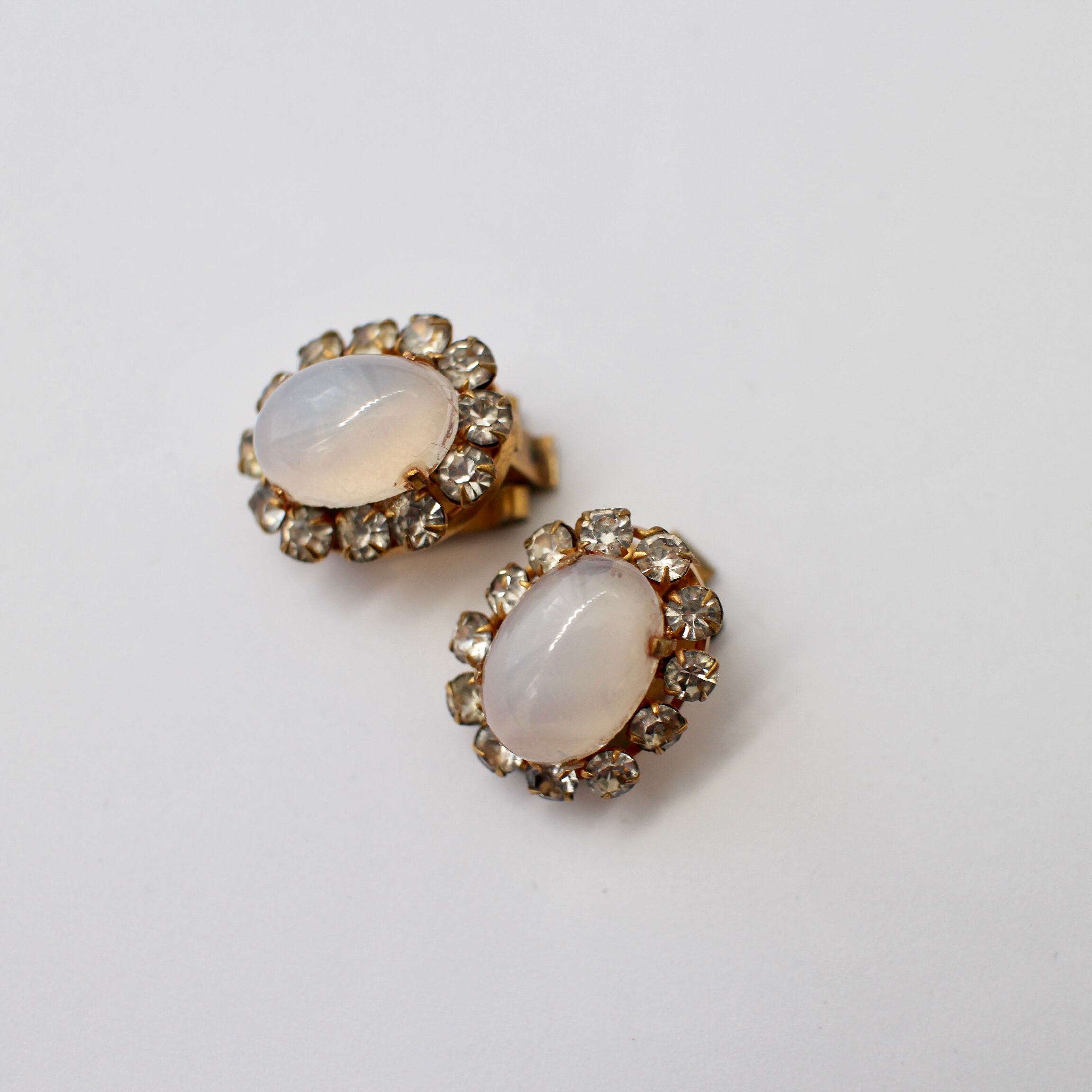 ミルキーホワイトオーバルガラス*クリアビジューフレーム*ヴィンテージイヤリング