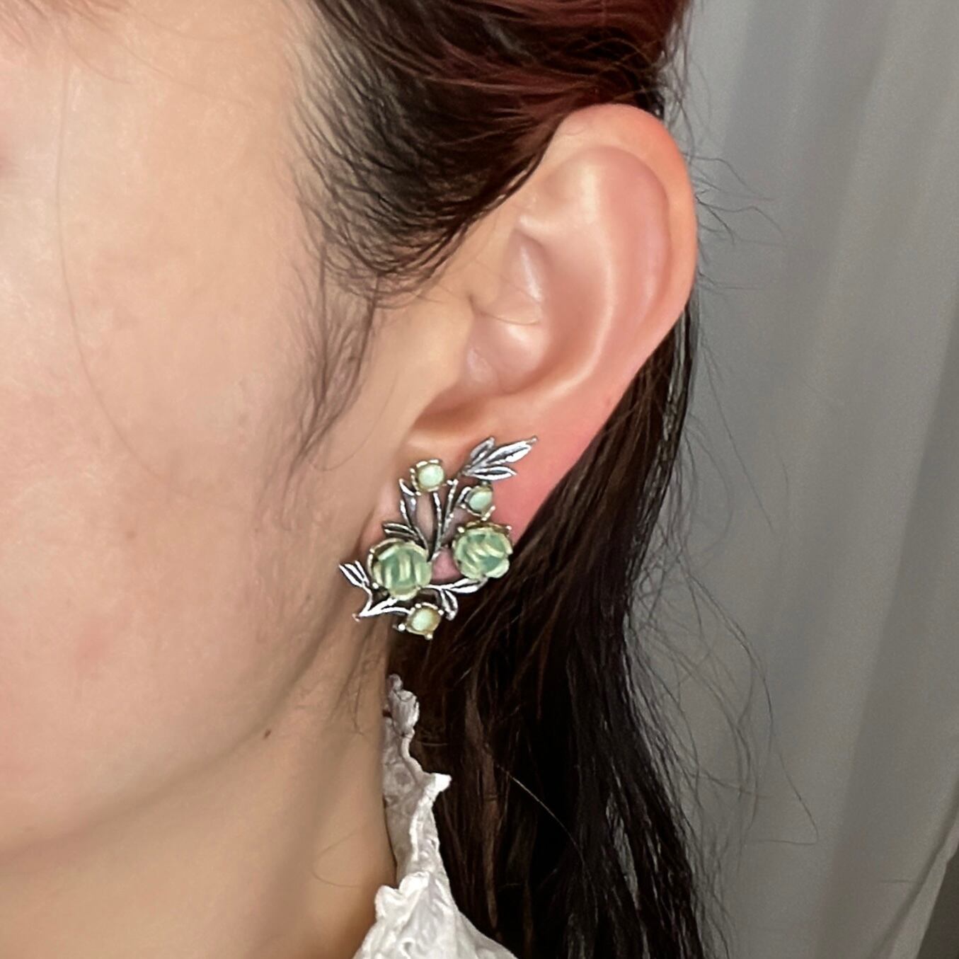 グリーンローズ*シルバーメタルリーフ*ヴィンテージイヤリング