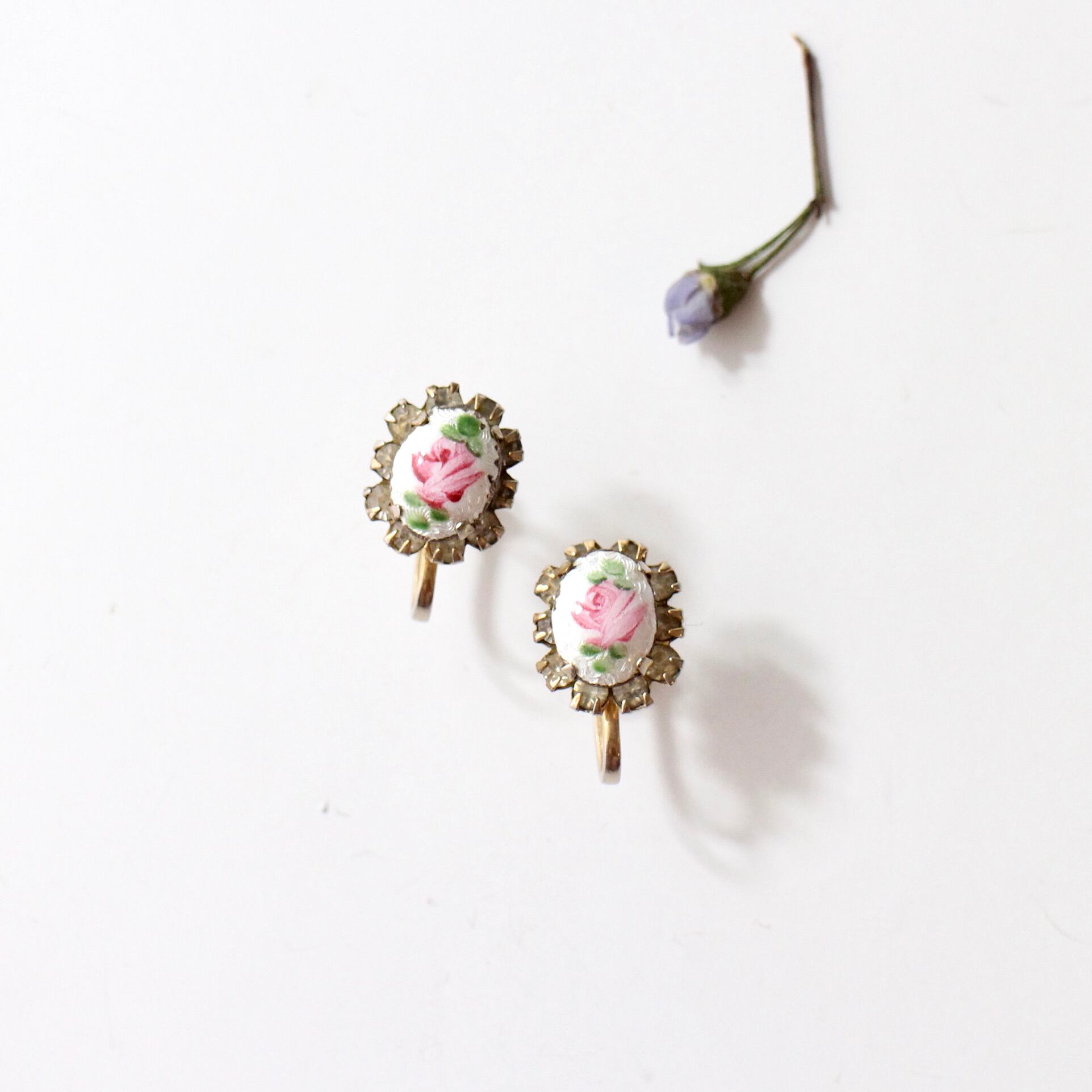 プチオーバルエナメル*ローズペイント*ヴィンテージイヤリング