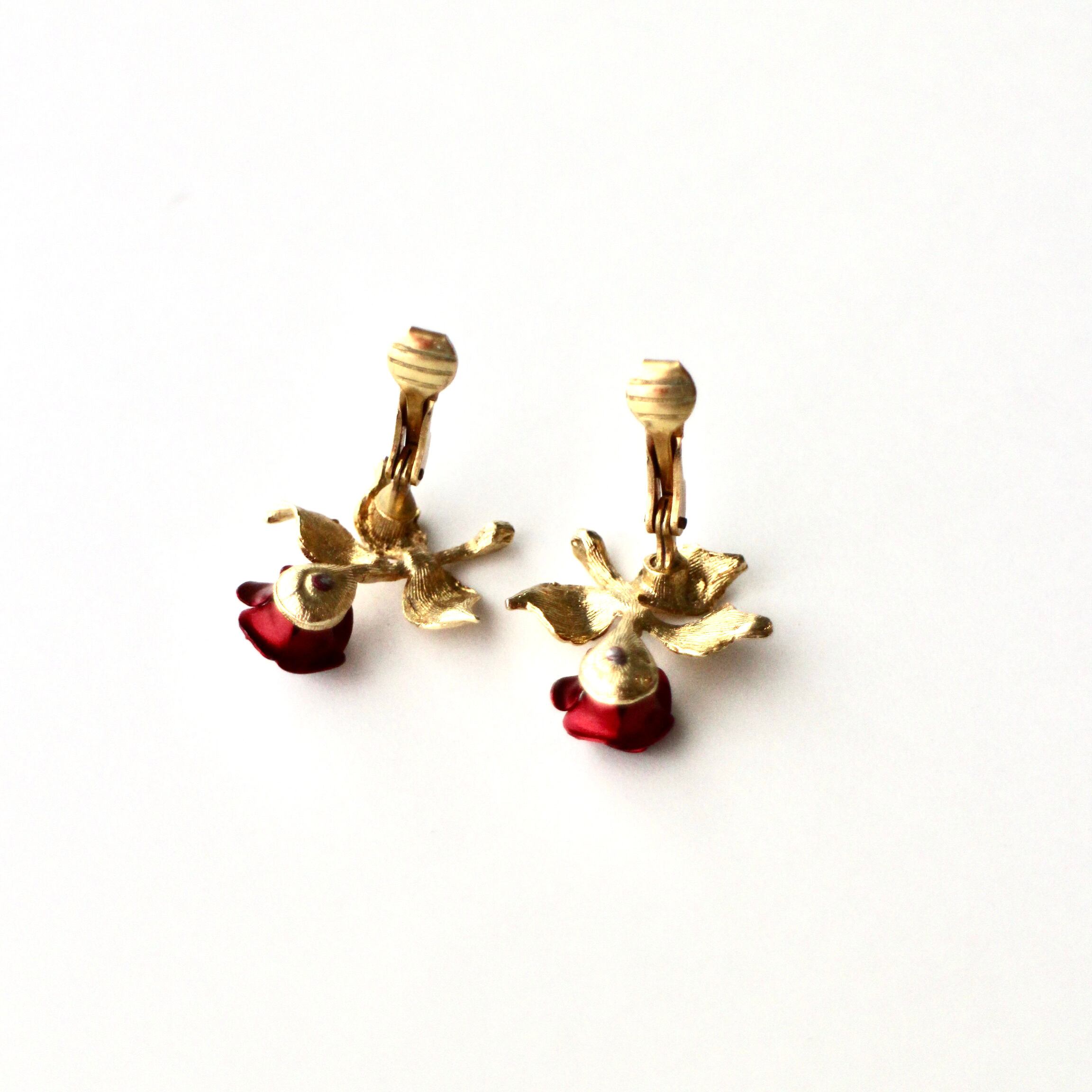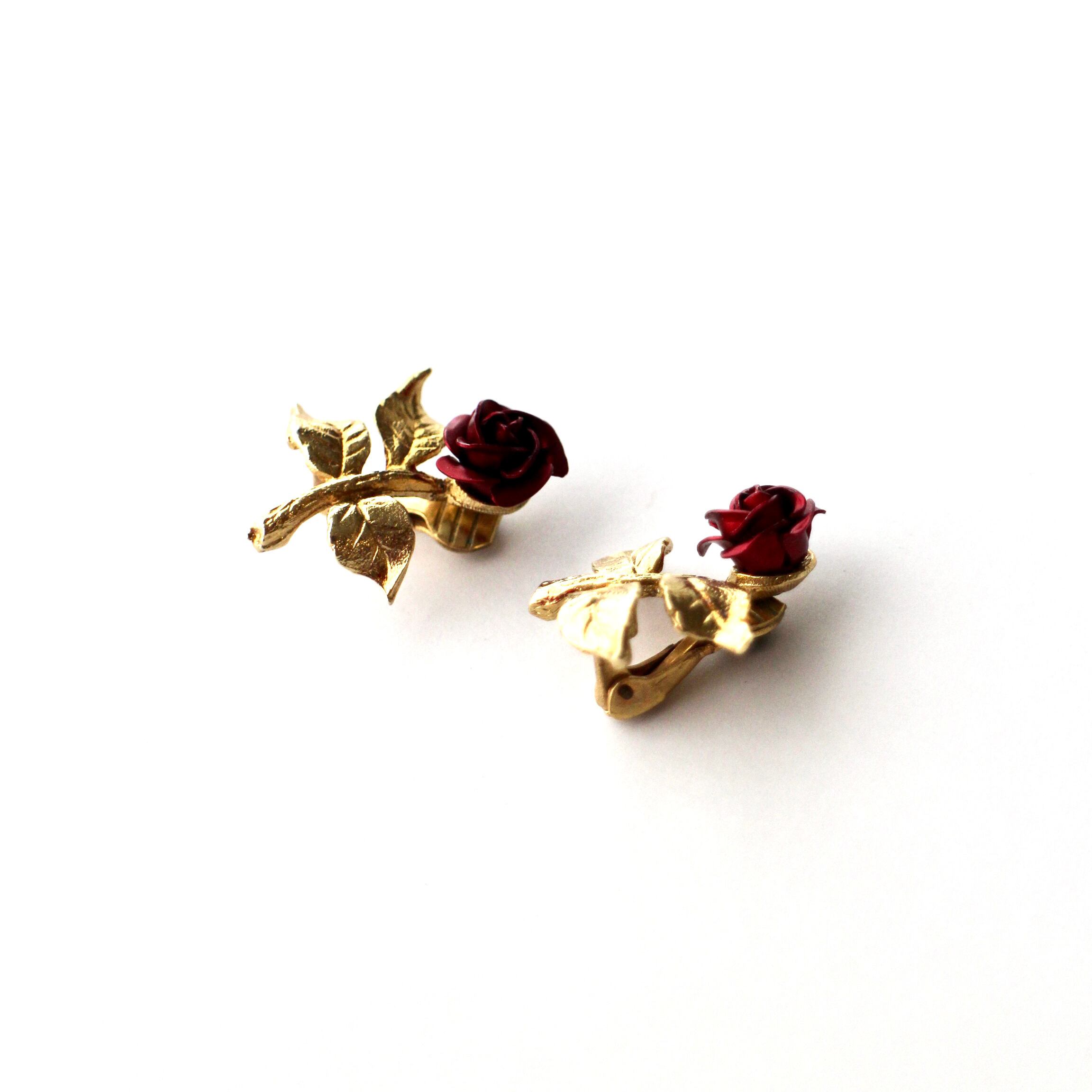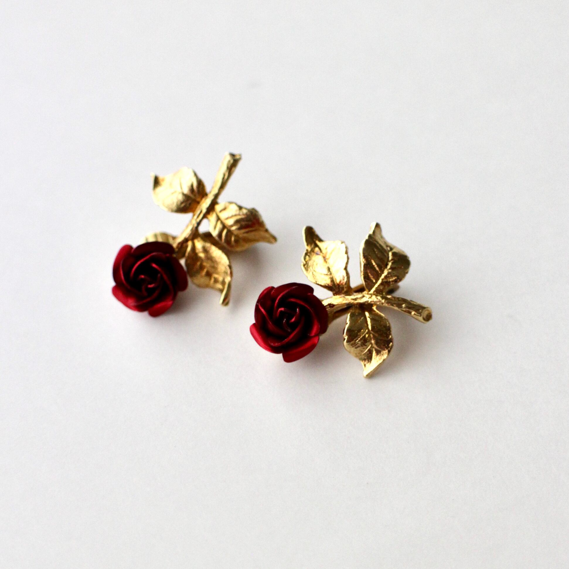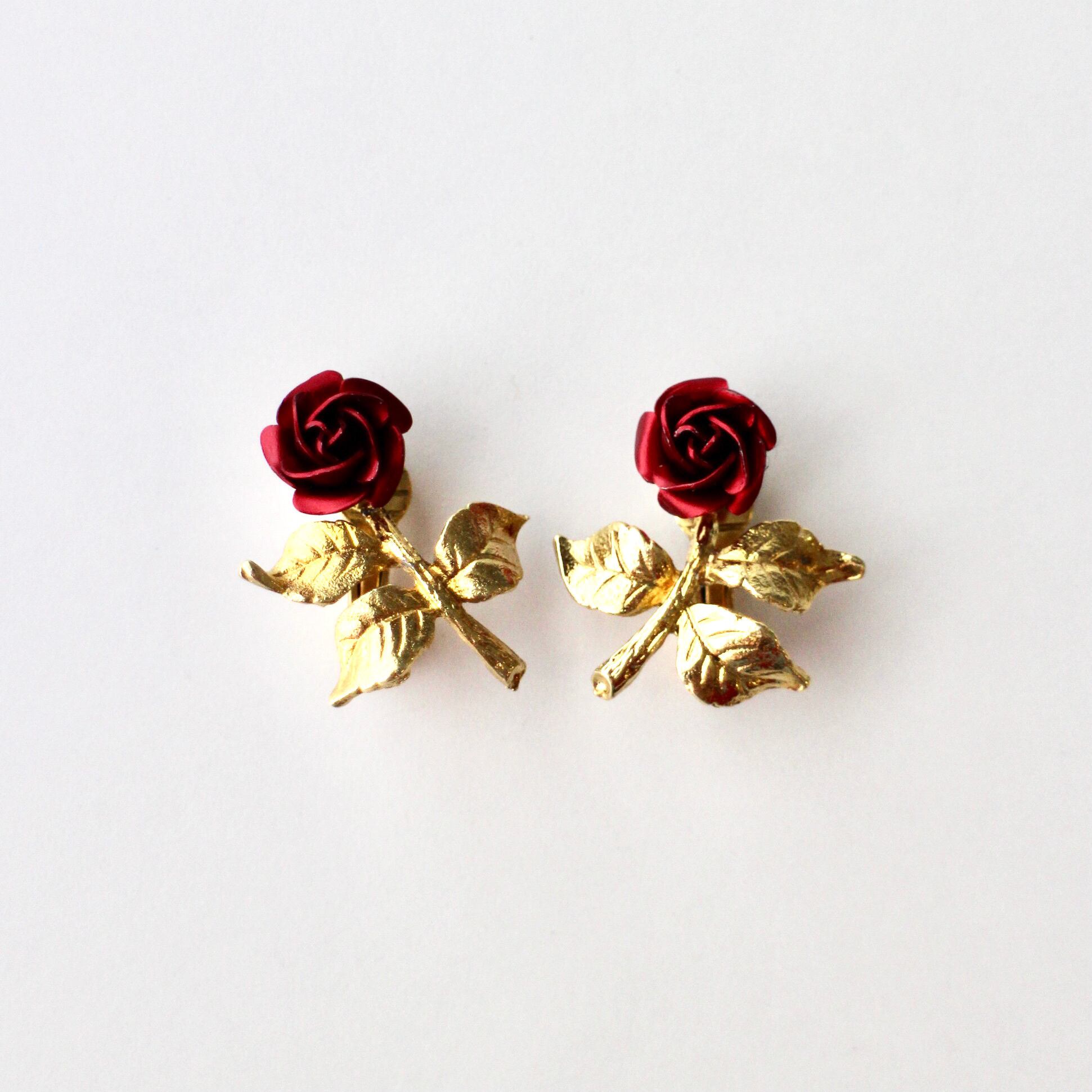 レッドローズ*メタルリーフ*ヴィンテージイヤリング