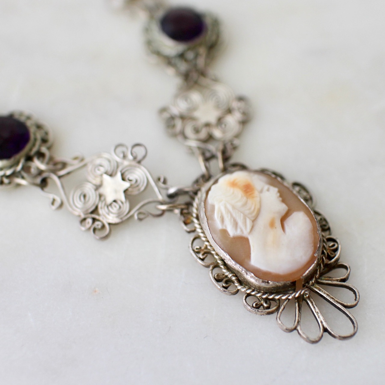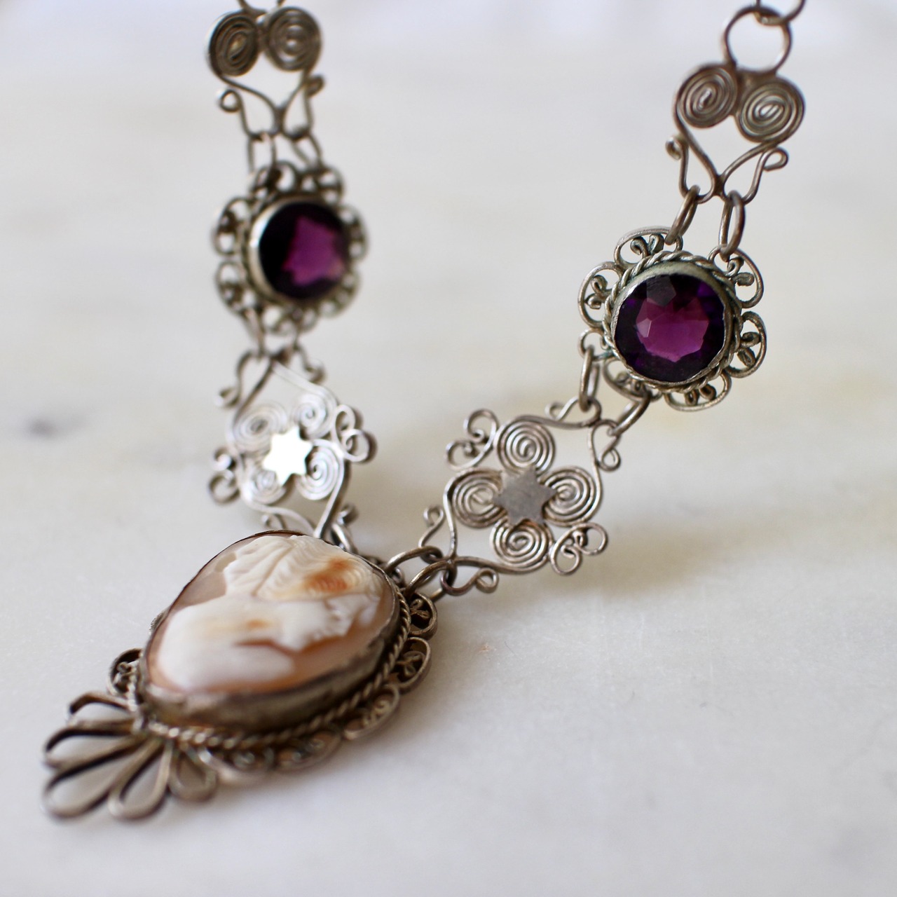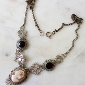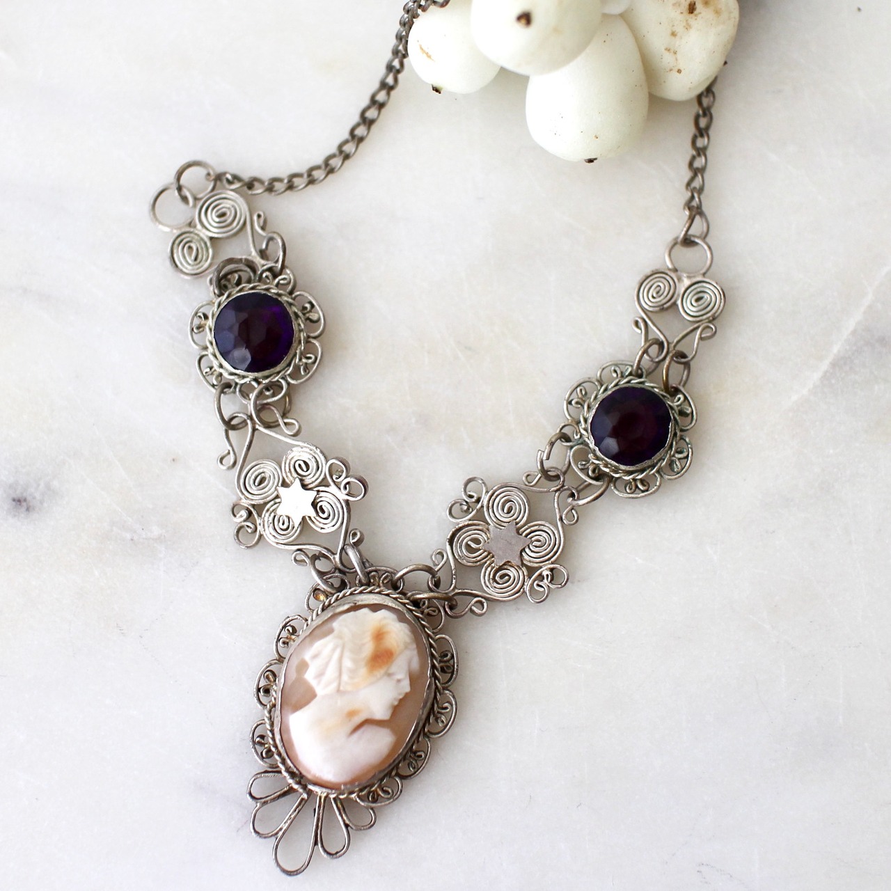 Art Deco*シェルカメオ*パープルガラス*繊細ネックレス